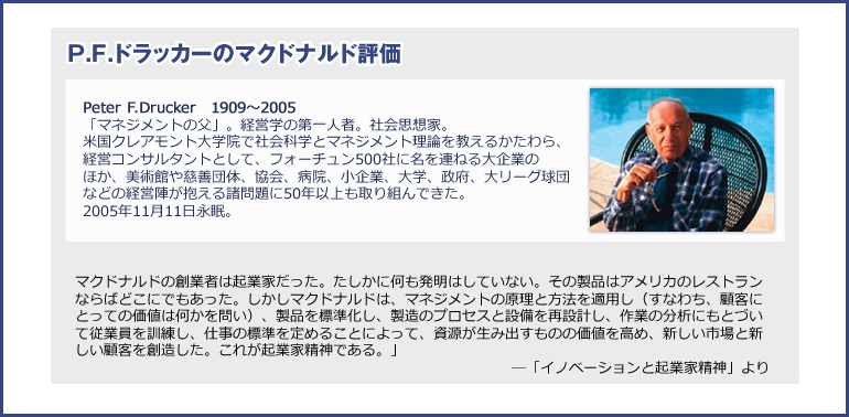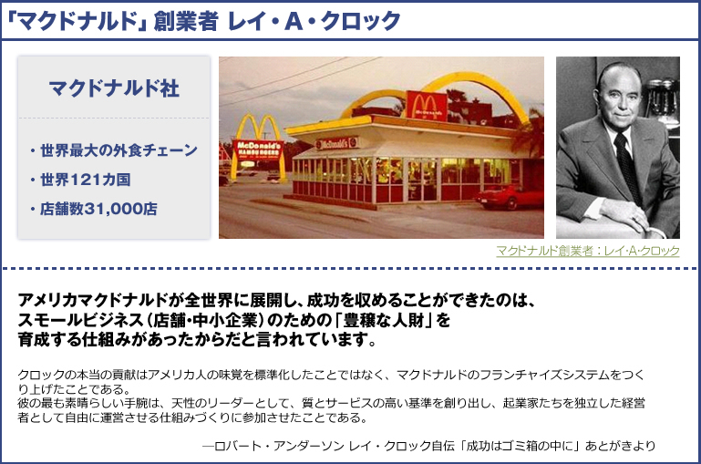 アメリカマクドナルド社は全世界121各国に31,000店の店舗を展開しています。その店舗売上獲得の要となっているのが店長(マネジャー)です。マクドナルドのマネジャー育成の仕組みは、創業者レイ・クロックが長年かけて開発したもので、そのノウハウを日本人として体得した林俊範がどの業種にも応用できるように編纂したものが本講座の「最強マネジャー育成プログラム」です。